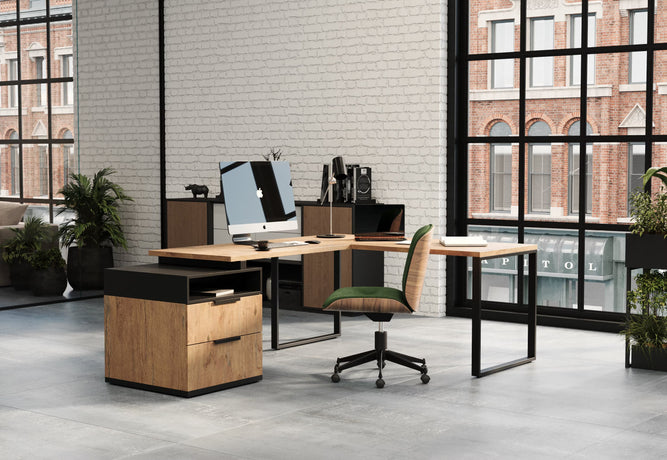 - oak-effect corner desks for warmth and versatility