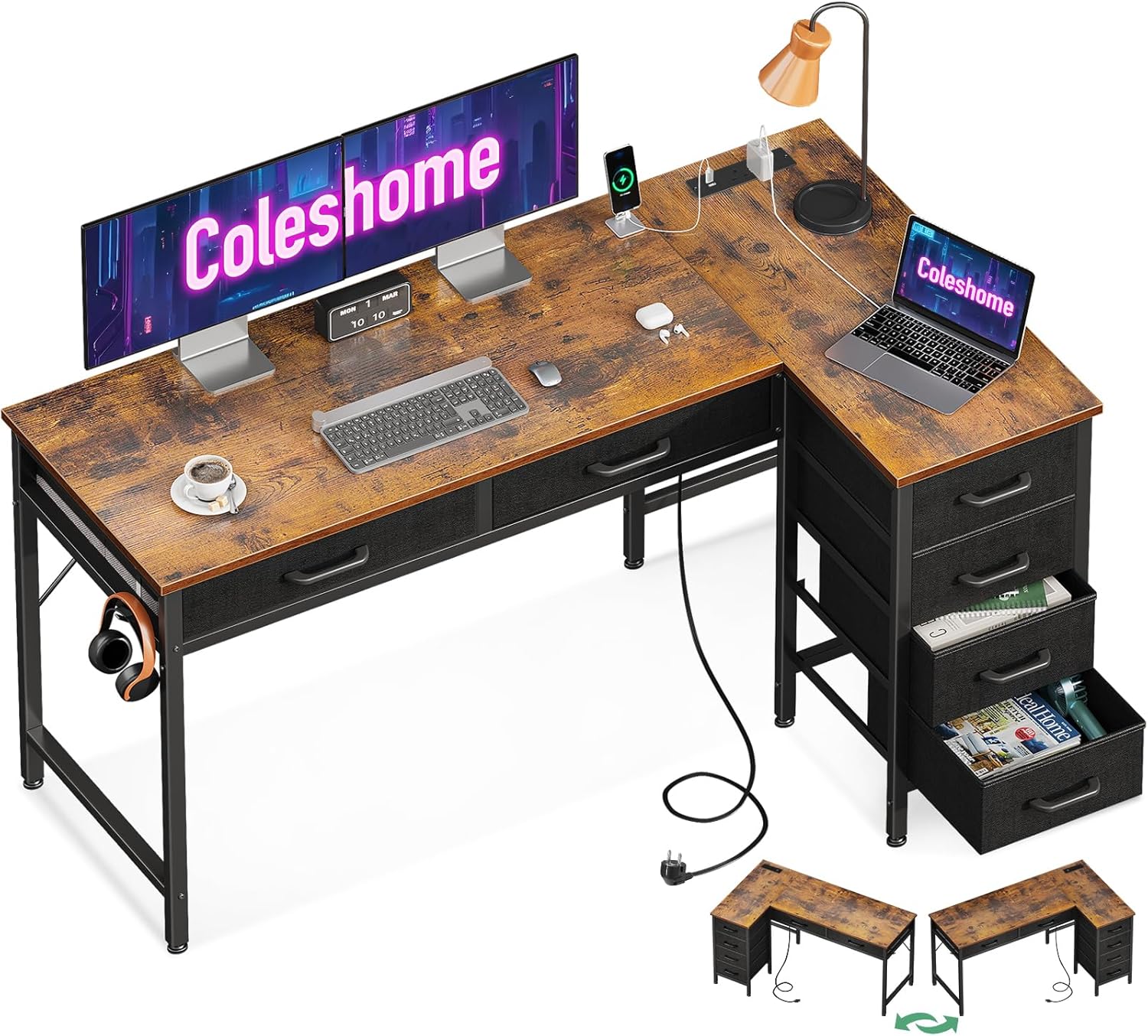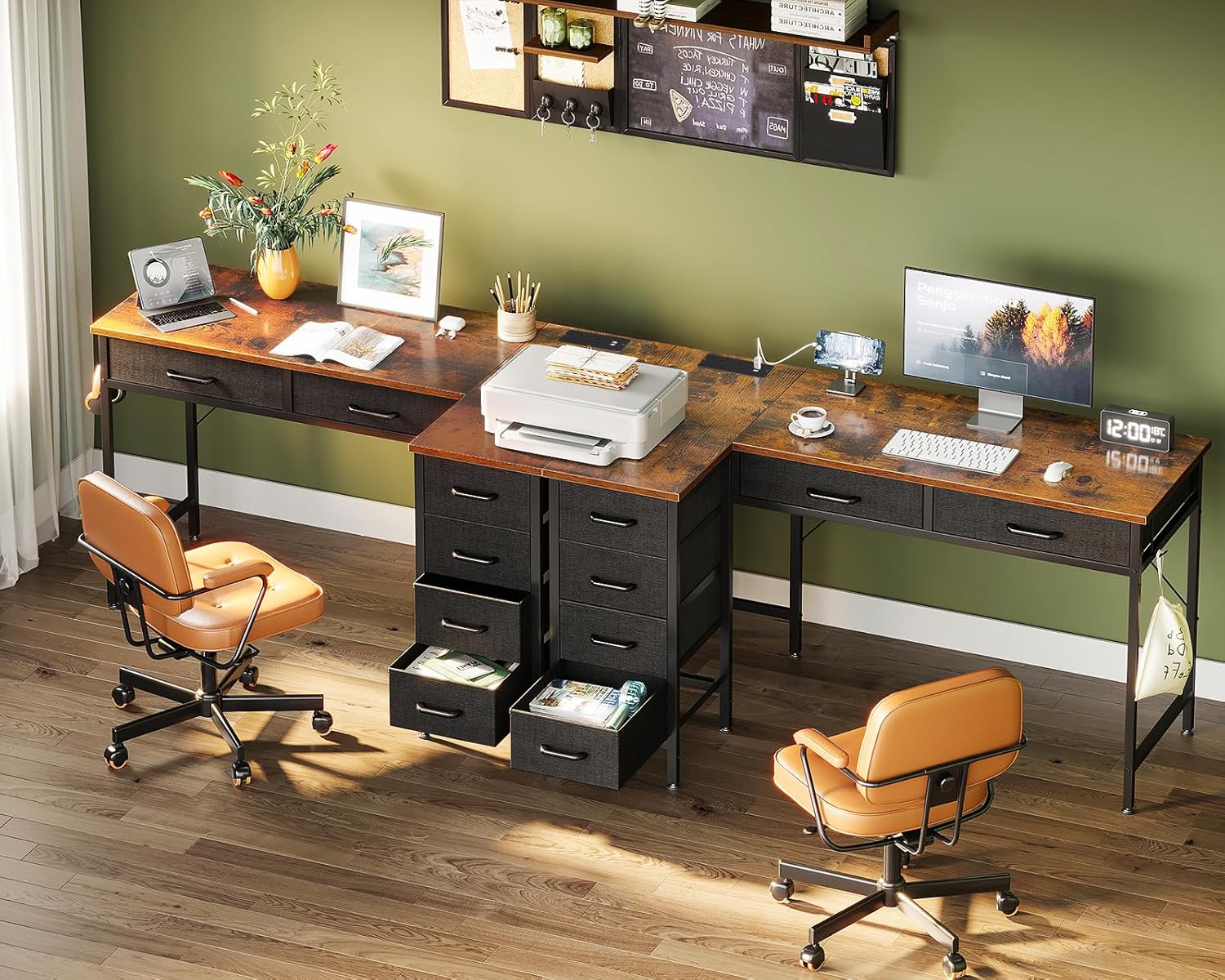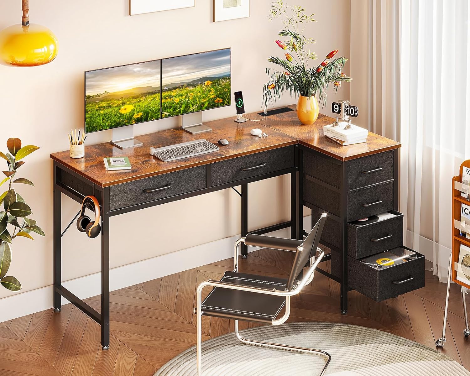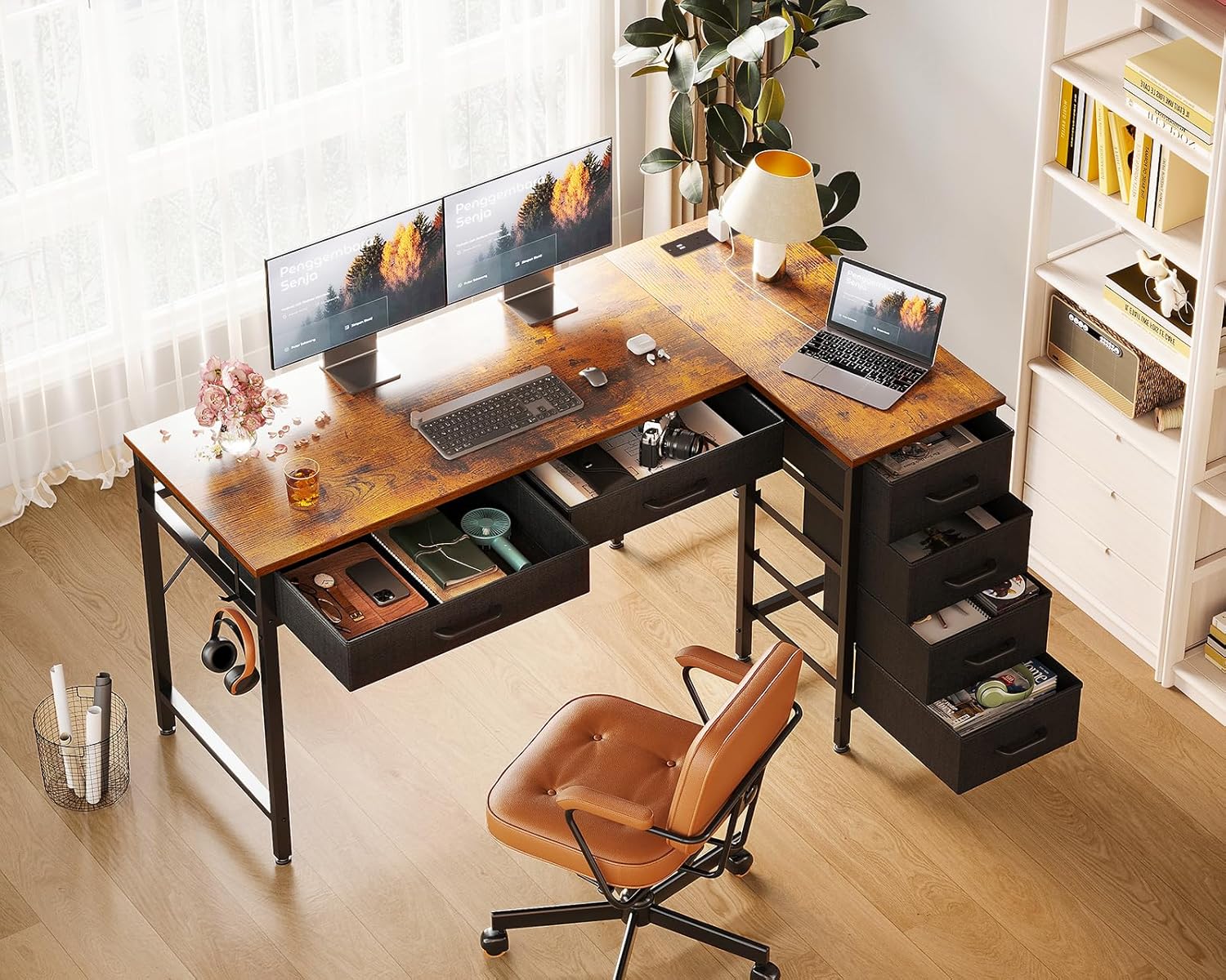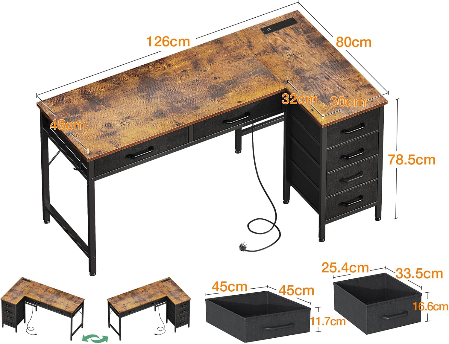 The Liani Reversible L-Shaped Desk in brown brings both style and practicality to any workspace. With six spacious fabric drawers and a convenient side hook, it offers generous storage for books, paperwork, and daily essentials while maintaining a clean and organized setup. The reversible L-shape allows flexible positioning for either left or right corner use, adapting perfectly to your room layout. A generous 96 cm of legroom ensures comfort for long hours of work, study, or gaming, making it ideal for home offices or creative setups alike.