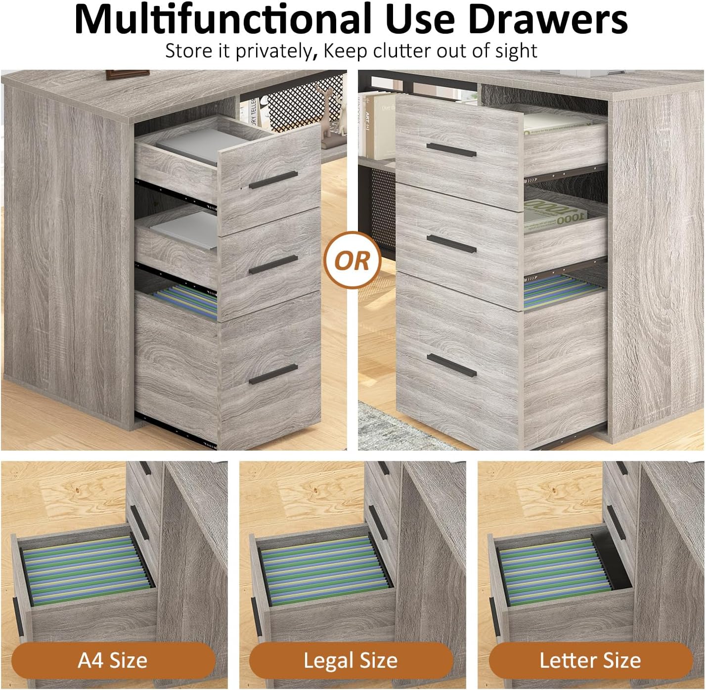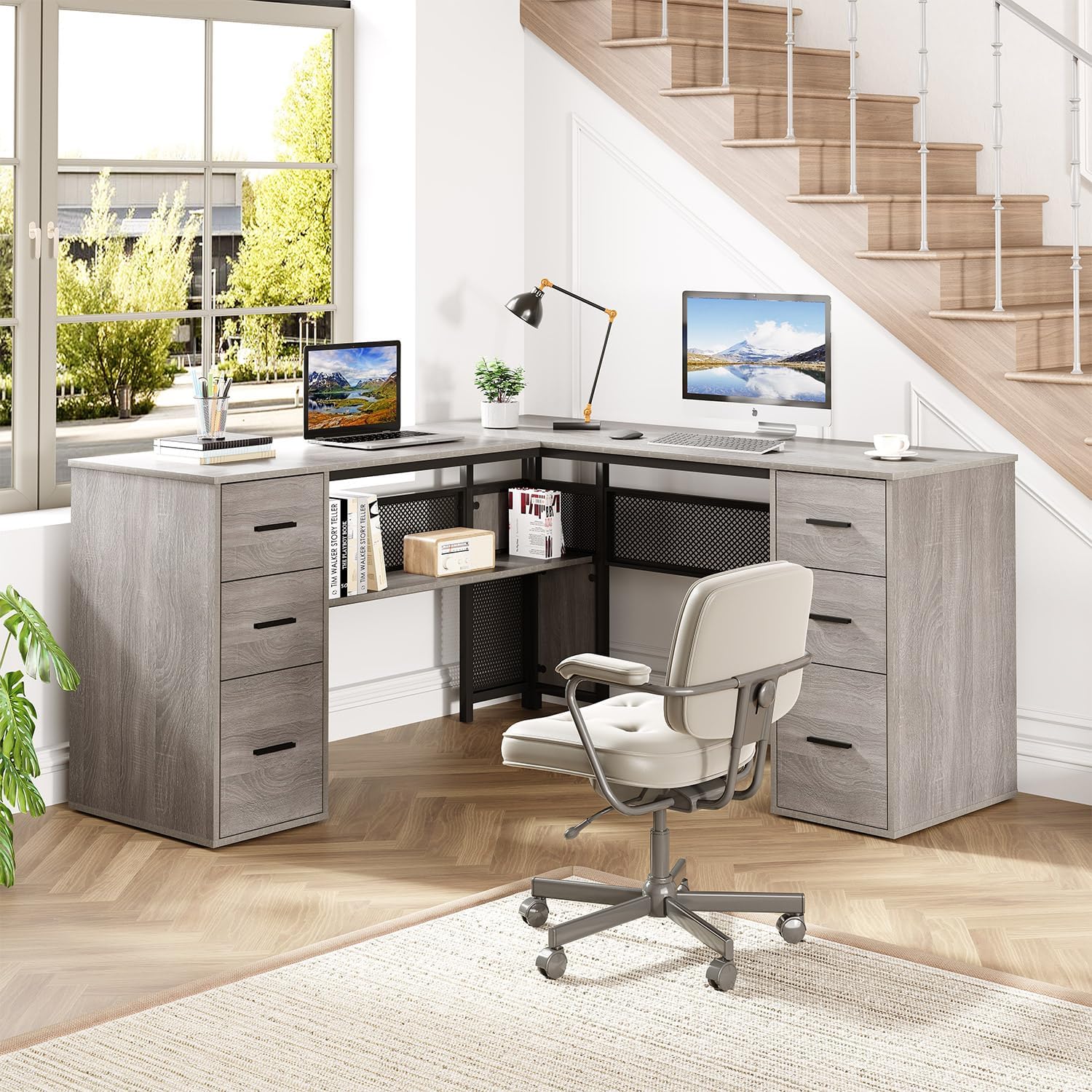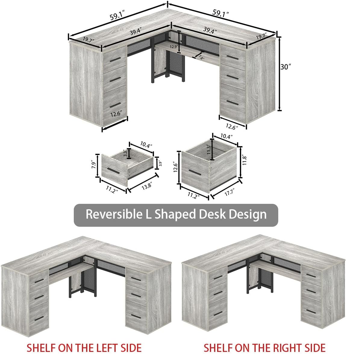 Upgrade your workspace with the Podhi L-Shaped Reversible Desk in Grey — a perfect fusion of modern rustic style, smart storage, and heavy-duty durability. Crafted with a premium light grey oak finish, this executive L-shaped desk is designed to maximise both productivity and space, making it ideal for home offices, gaming setups, or professional work environments. The robust metal frame paired with high-quality MDF ensures exceptional stability with no shaking or movement, while the reversible L-shape allows you to customise the layout to suit your room perfectly. With a generous surface area, integrated shelving, and a versatile drawer system, the Podhi desk delivers a clean, organised, and highly functional workspace that looks as good as it performs.