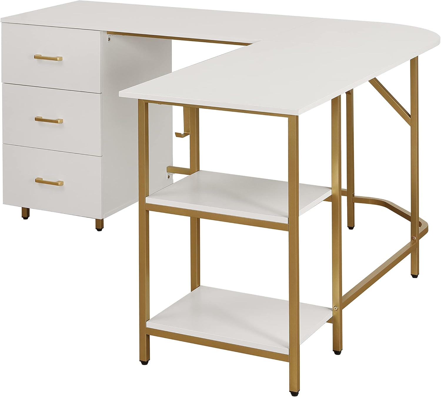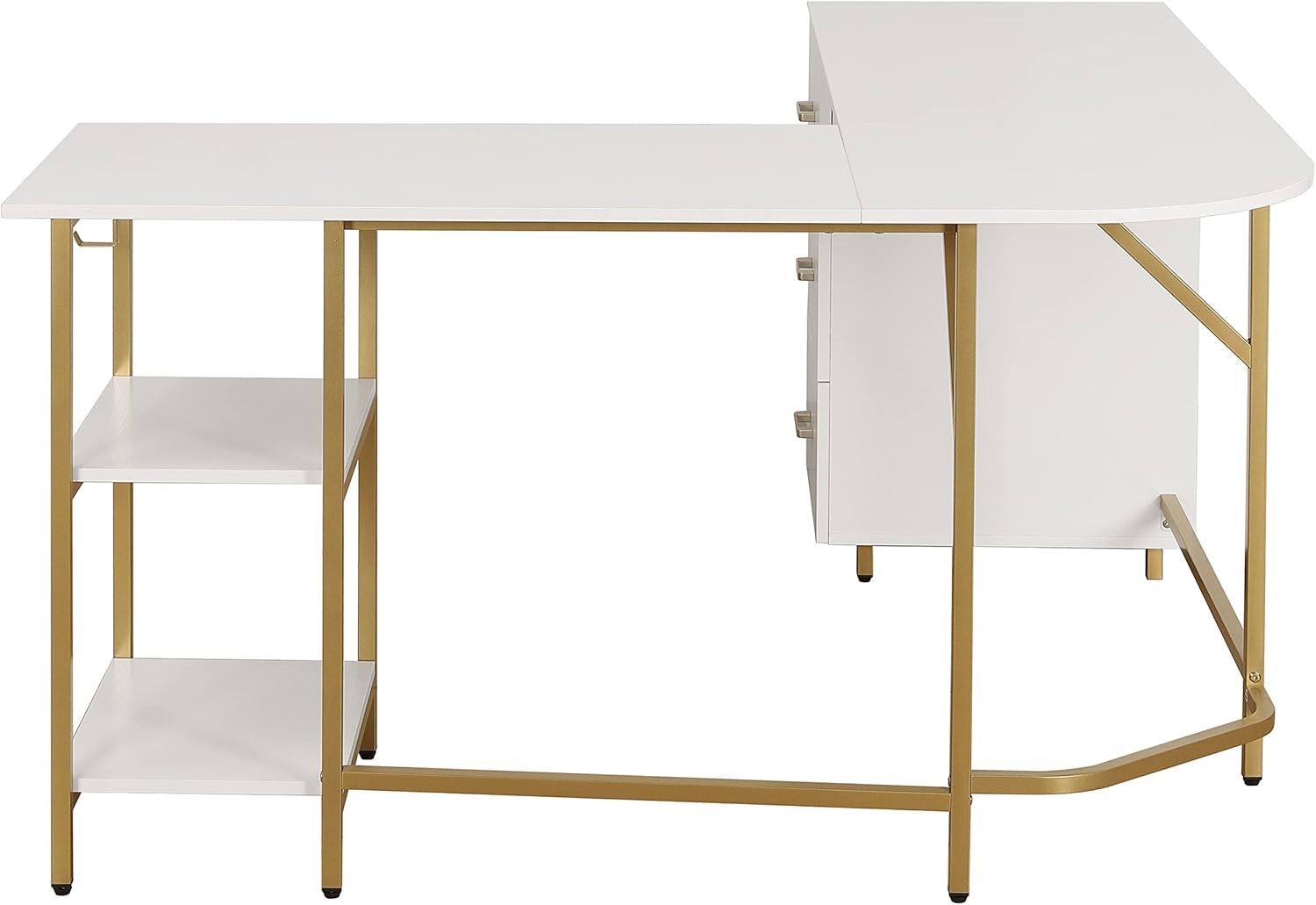 Bring elegance and functionality to your workspace with the Amanda Modern Corner Computer Desk – White/Gold. Designed with a perfect balance of style and practicality, this L-shaped desk maximizes your office or study area while creating an efficient and organized environment. Its clean white engineered wood surface paired with sleek gold steel accents adds a modern, sophisticated touch that complements any home or office décor.