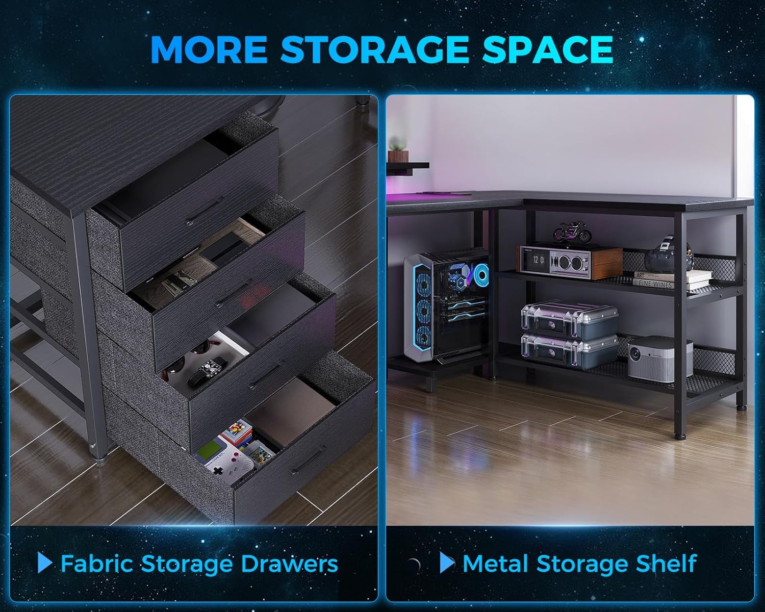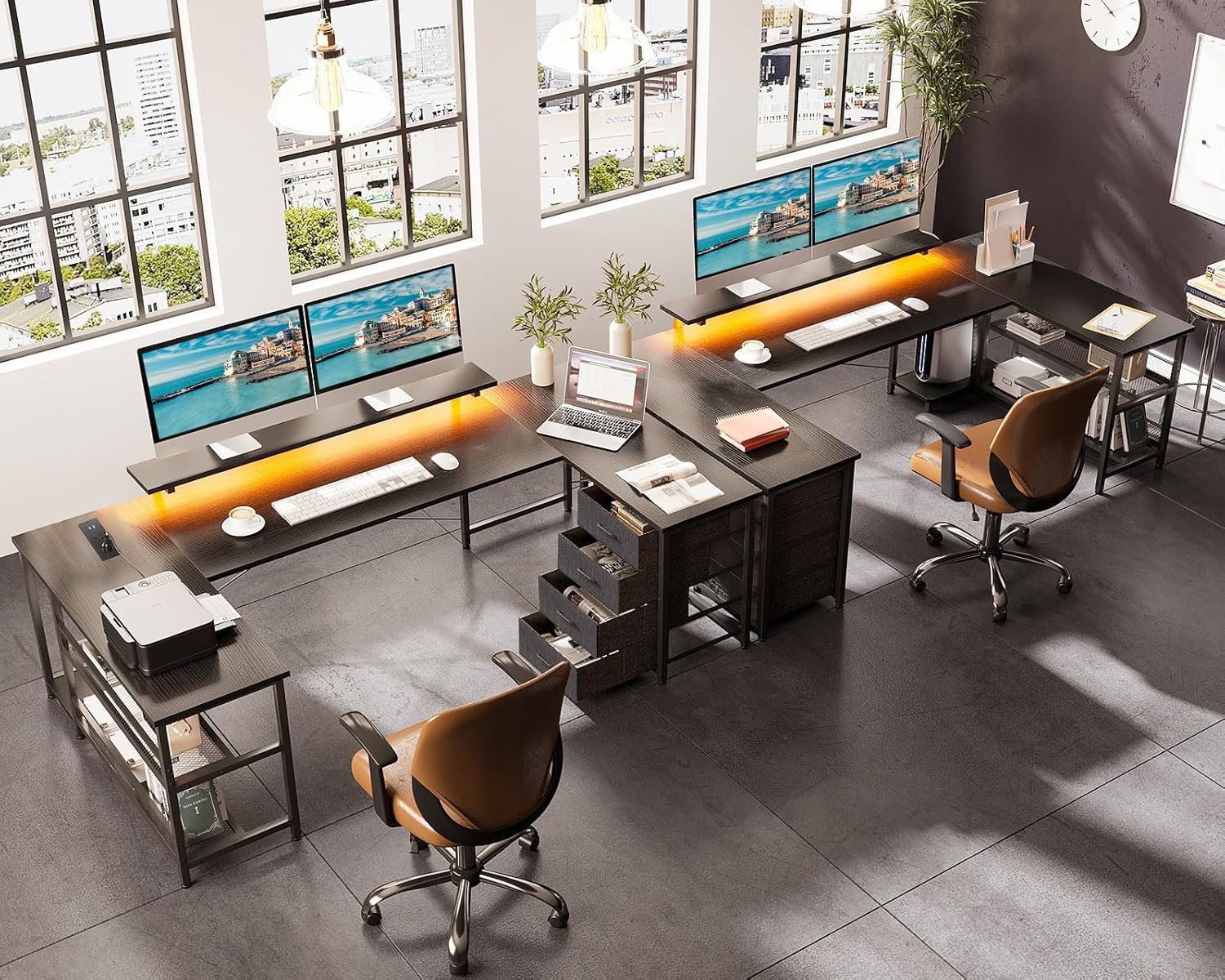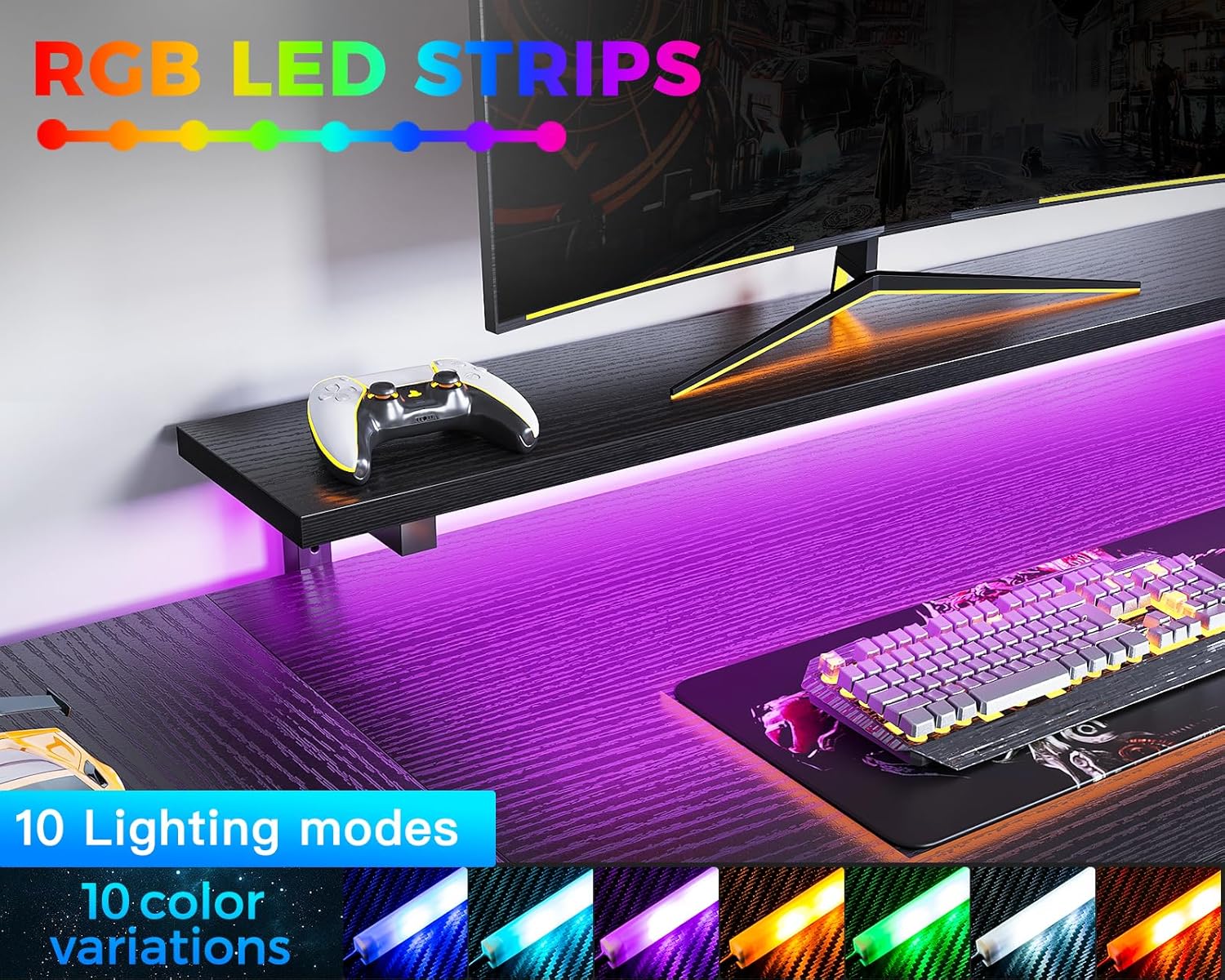 The Fenwick L-Shaped Gaming Desk with LED Lights – Black is designed for gamers who want maximum immersion, organization, and performance. With its modern design, integrated monitor stand, and customizable RGB lighting, this desk transforms any room into a dynamic gaming station. The L-shaped/U-shaped layout fits neatly into corners while providing plenty of space for gaming setups, accessories, and workflow needs.