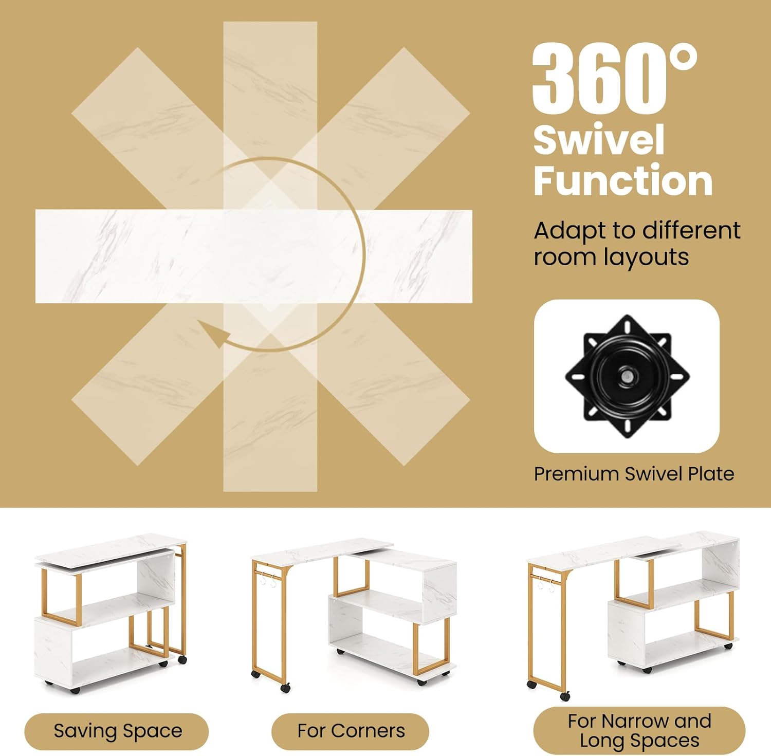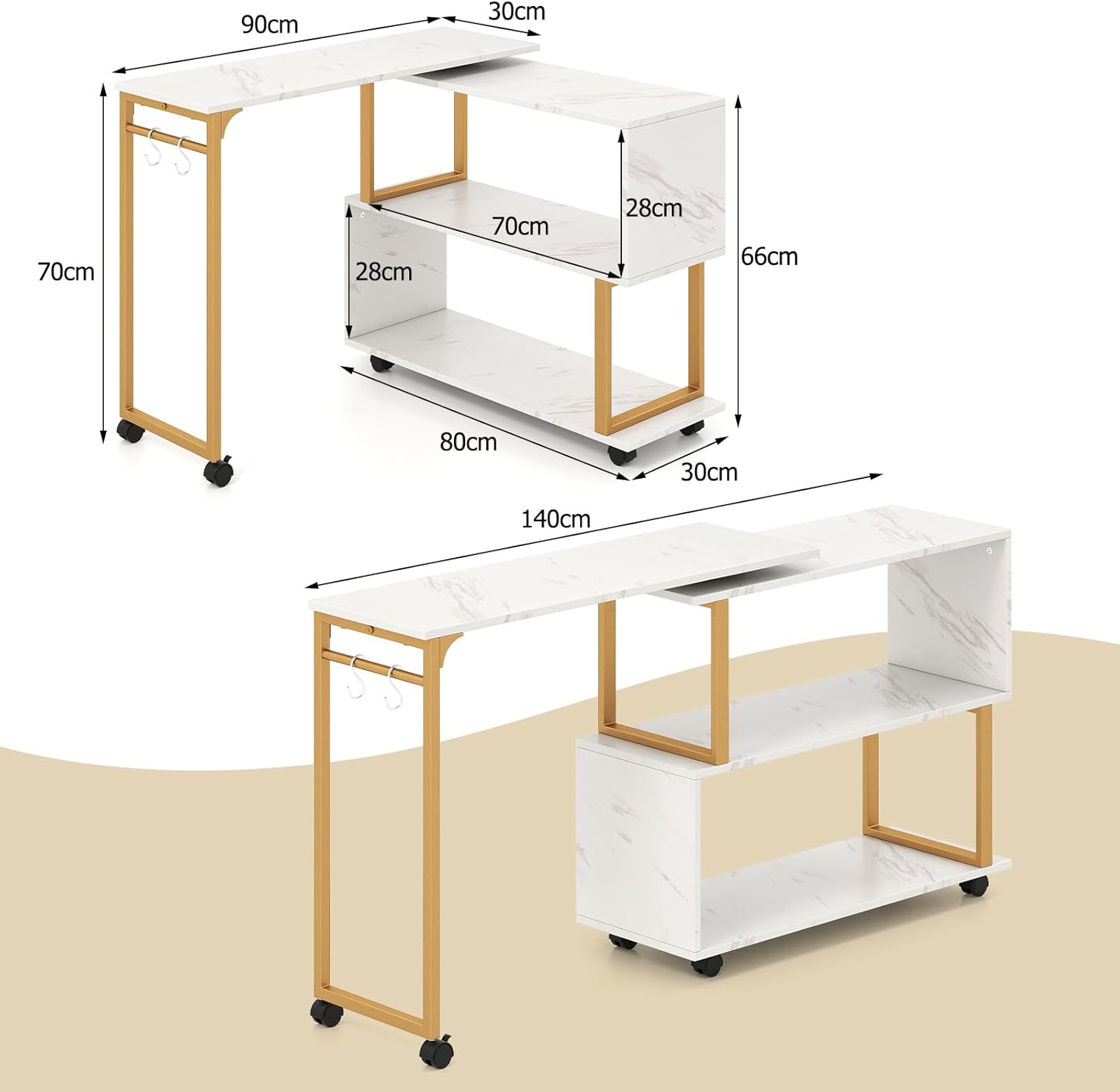 The Isla L-Shaped Corner Desk - White/Gold offers a perfect balance of elegance, versatility, and practicality for modern living spaces. Featuring a 360° rotating tabletop, this convertible desk easily transforms from a sleek long desk to a compact L-shaped corner workstation, adapting seamlessly to different room layouts. When fully expanded, it measures 140 x 30 x 70 cm, and when folded, it compacts down to 90 x 30 x 70 cm—making it ideal for both spacious and smaller homes.