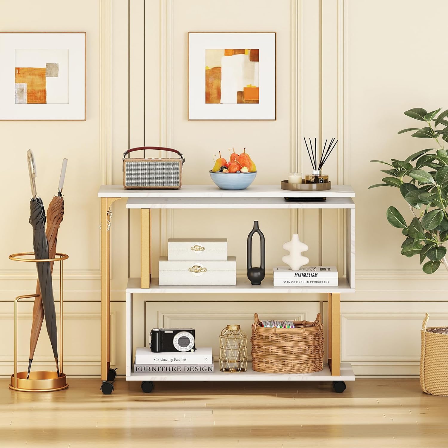 - Faux marble top and chic gold frame add a touch of luxury to your space