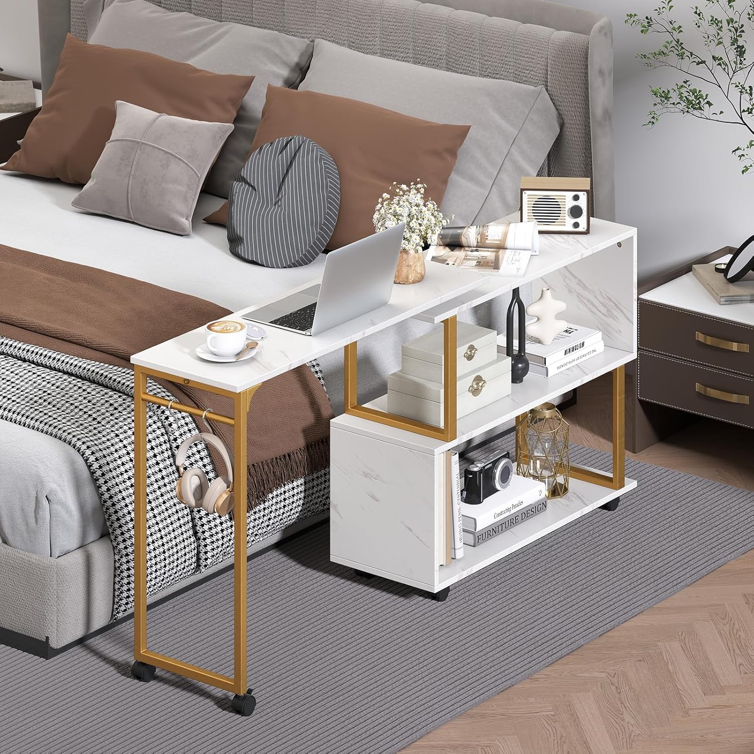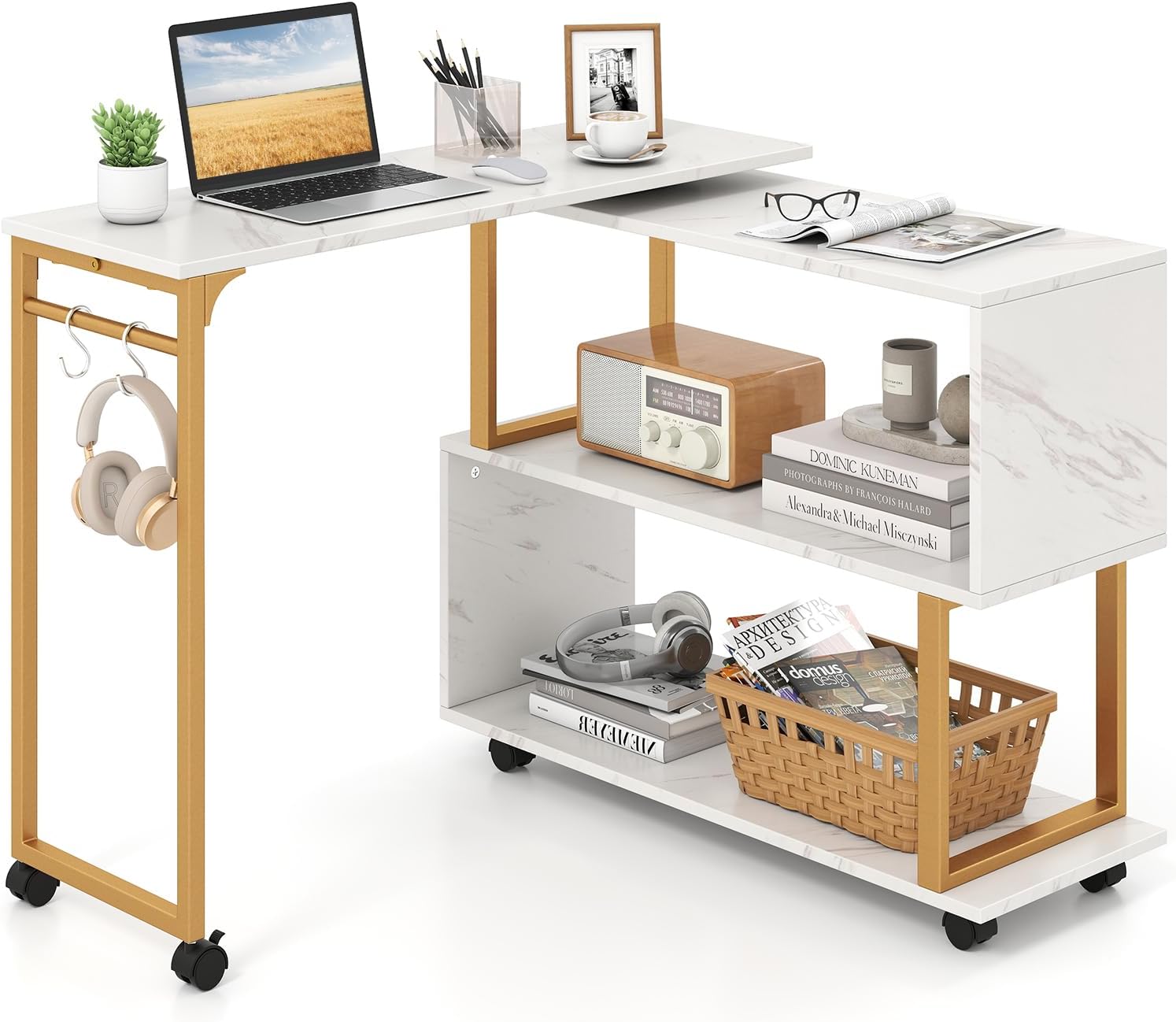 For added convenience, the desk comes with 6 universal casters, 2 of which are lockable, making it easy to move around and secure in place when needed. The faux marble tabletop paired with a chic gold frame elevates the look of any room, blending luxury with functionality. Whether used as a study desk, home office workstation, or decorative console, the Isla L-Shaped Desk is both stylish and practical.