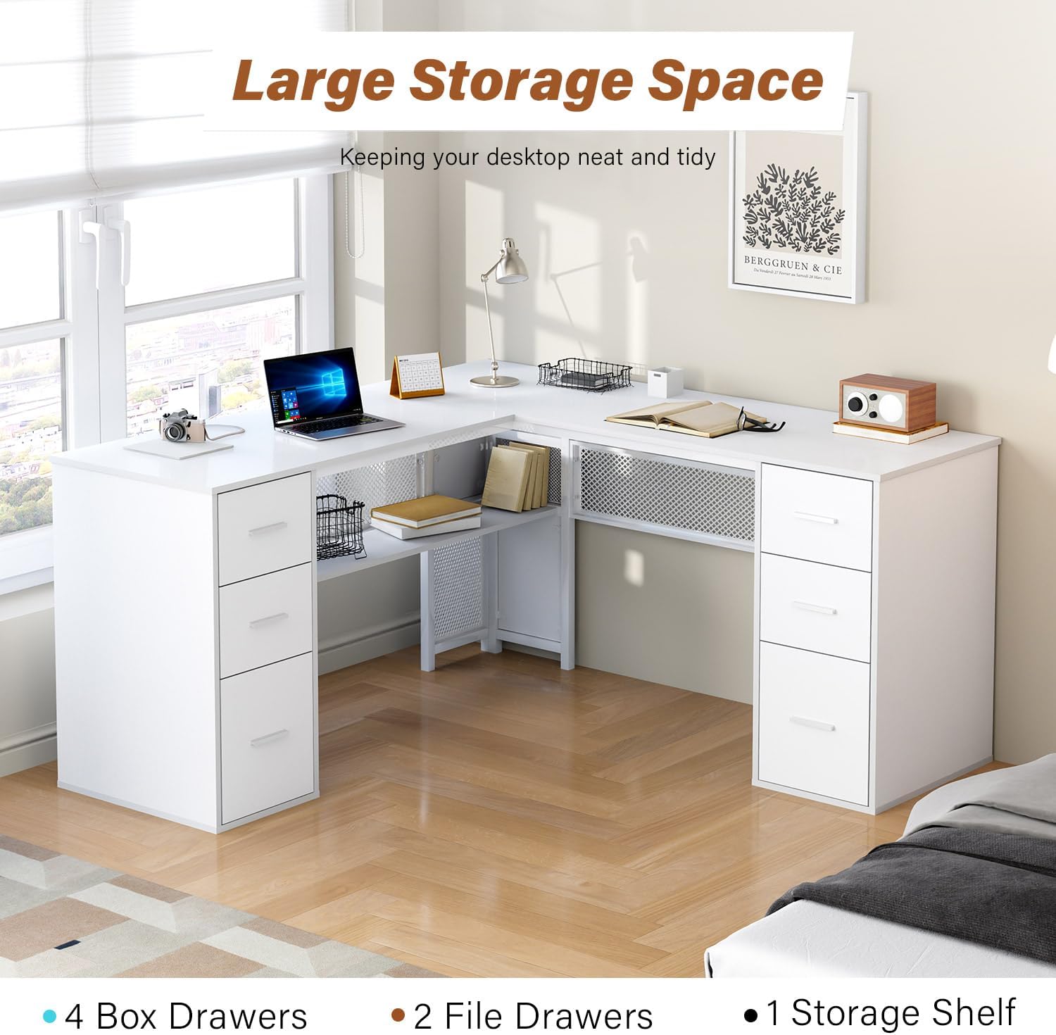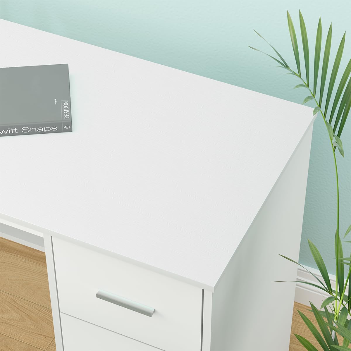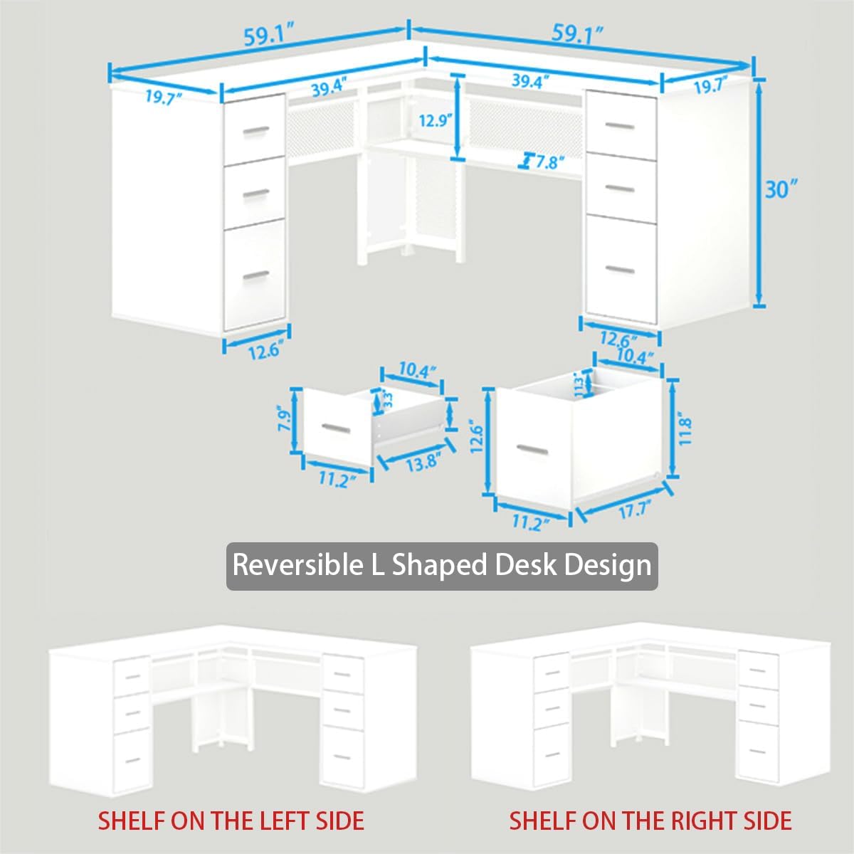 Built with engineered wood and a heavy-duty matte white metal frame, the Louie Desk is not only stylish but also built to last. Its L-shaped structure makes it a perfect space-saving solution, fitting neatly into corners while still offering generous working and storage space. With six drawers, open shelving, and reversible configuration, this desk adapts to your needs—whether you need file storage, quick access to supplies, or a clutter-free setup.