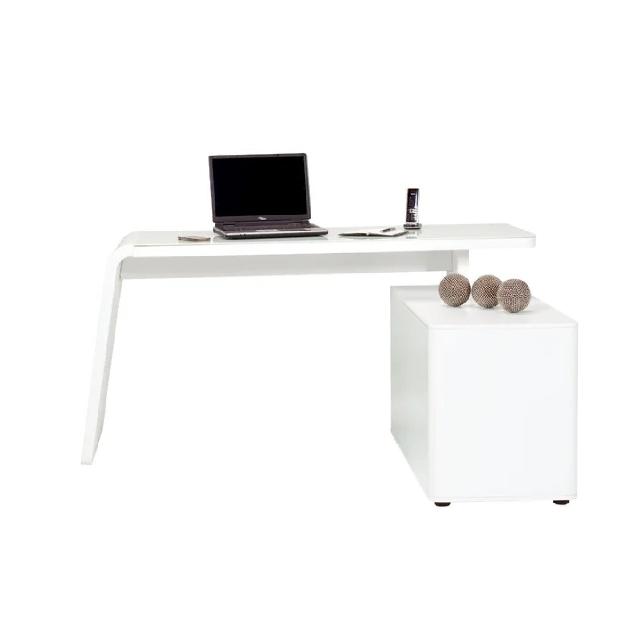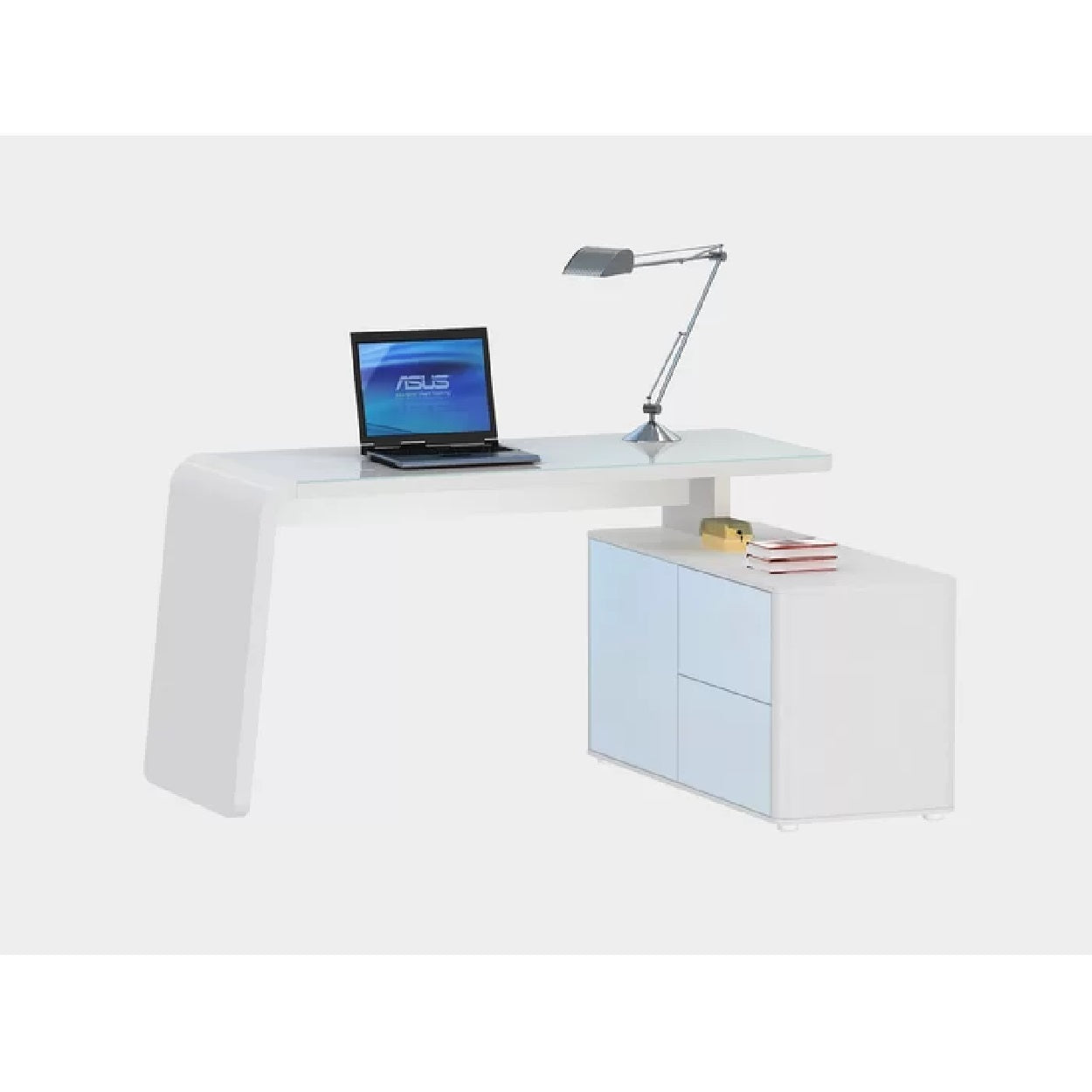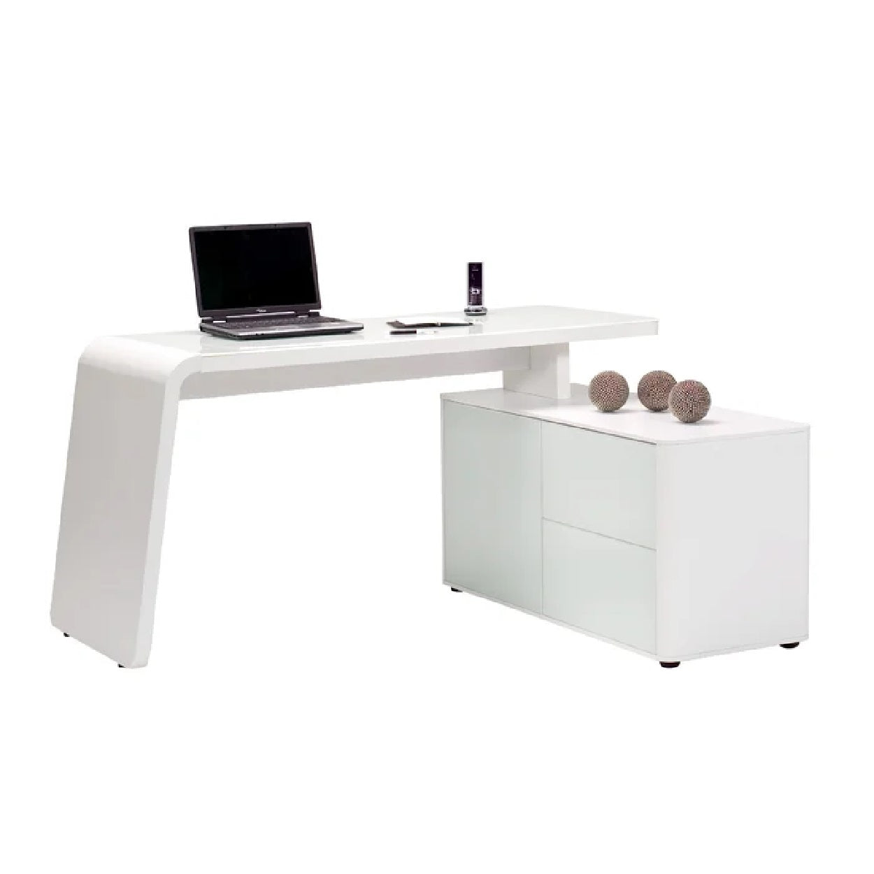 The elegant Peyton L-shaped corner desk features a matte varnish finish on its structural elements, adding a refined touch. Its radiused corners enhance its stylish design, while the planked flank orientation gives it a distinctive appearance. The tabletop is topped with a sleek glass plate, making cleanup effortless. The storage unit includes a push-to-open mechanism, two pull-out drawers with matching glass panels, and a glass-fronted door concealing a compartment with an adjustable shelf. Additionally, the storage unit can be installed on either the left or right side, offering flexibility to suit your space.