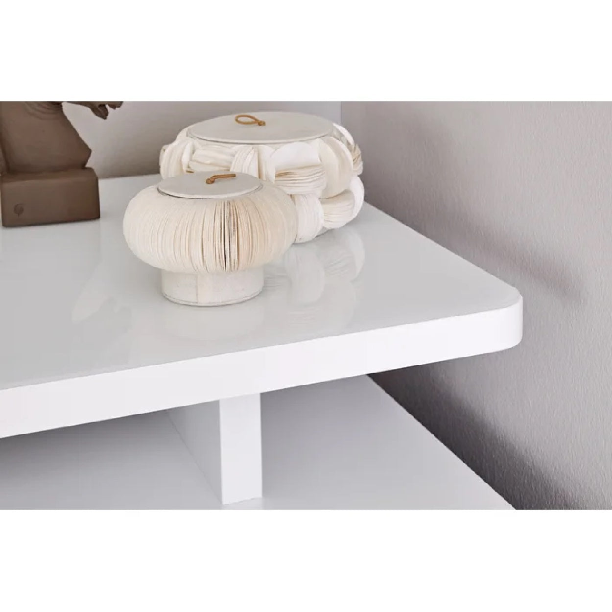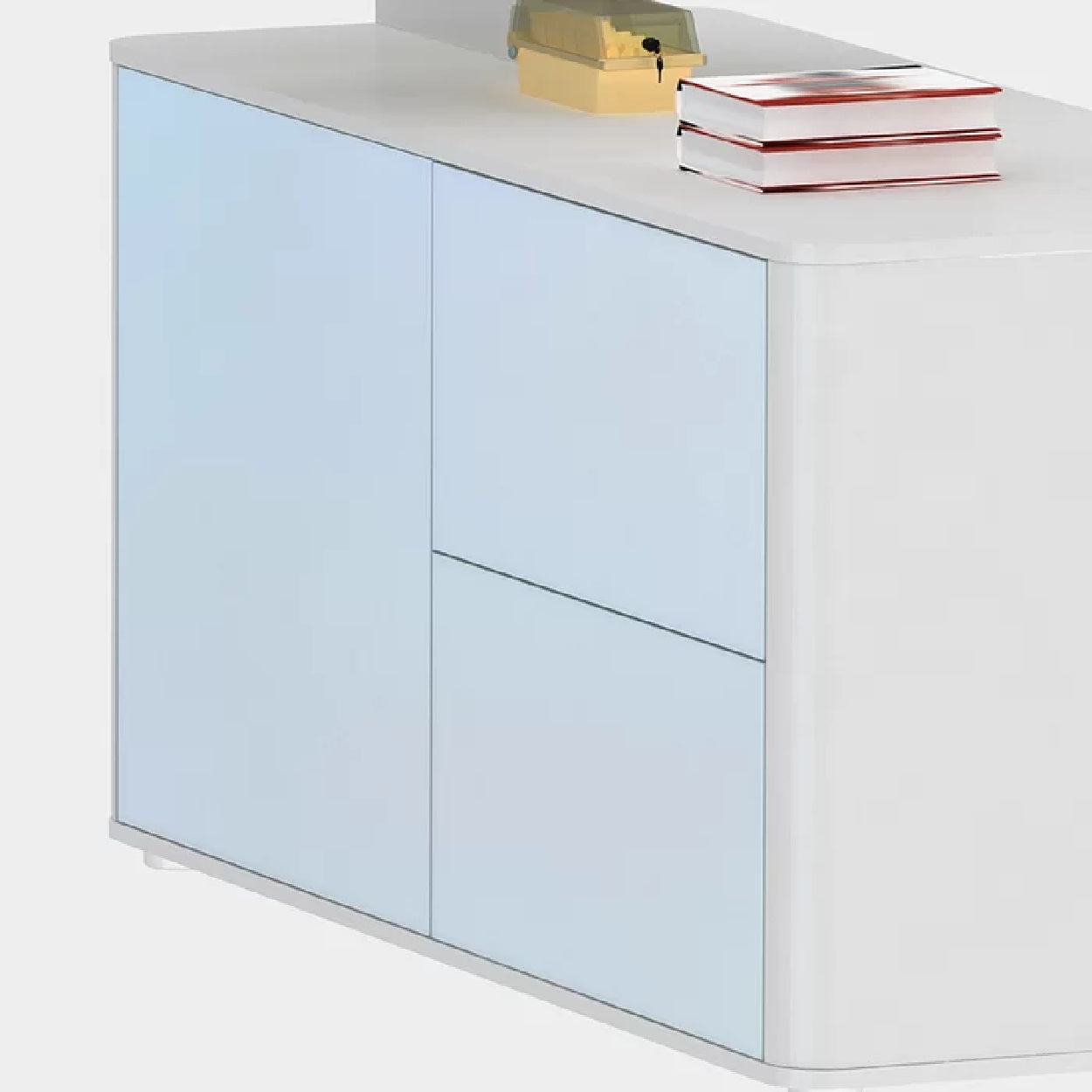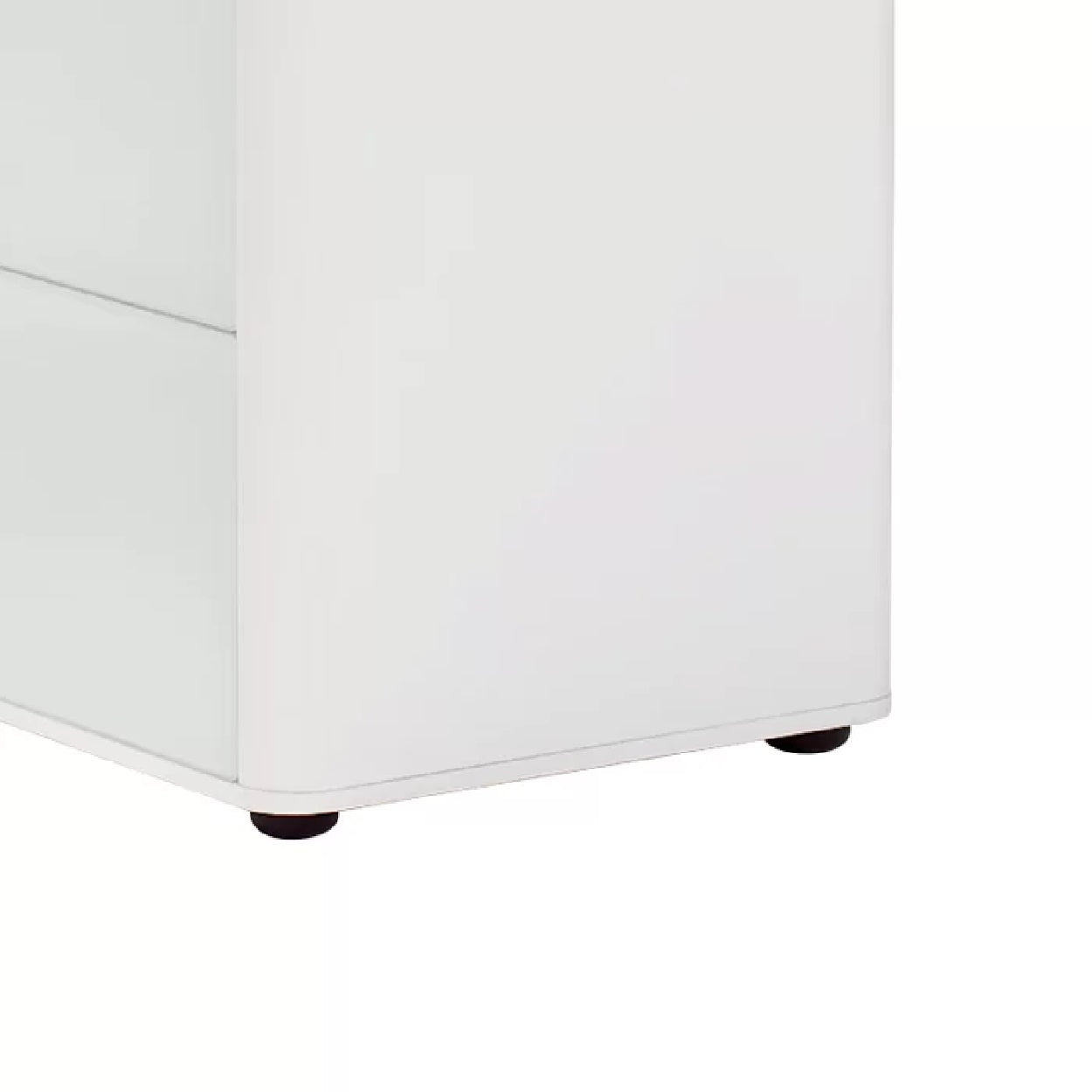 The elegant Peyton L-shaped corner desk features a matte varnish finish on its structural elements, adding a refined touch. Its radiused corners enhance its stylish design, while the planked flank orientation gives it a distinctive appearance. The tabletop is topped with a sleek glass plate, making cleanup effortless. The storage unit includes a push-to-open mechanism, two pull-out drawers with matching glass panels, and a glass-fronted door concealing a compartment with an adjustable shelf. Additionally, the storage unit can be installed on either the left or right side, offering flexibility to suit your space.