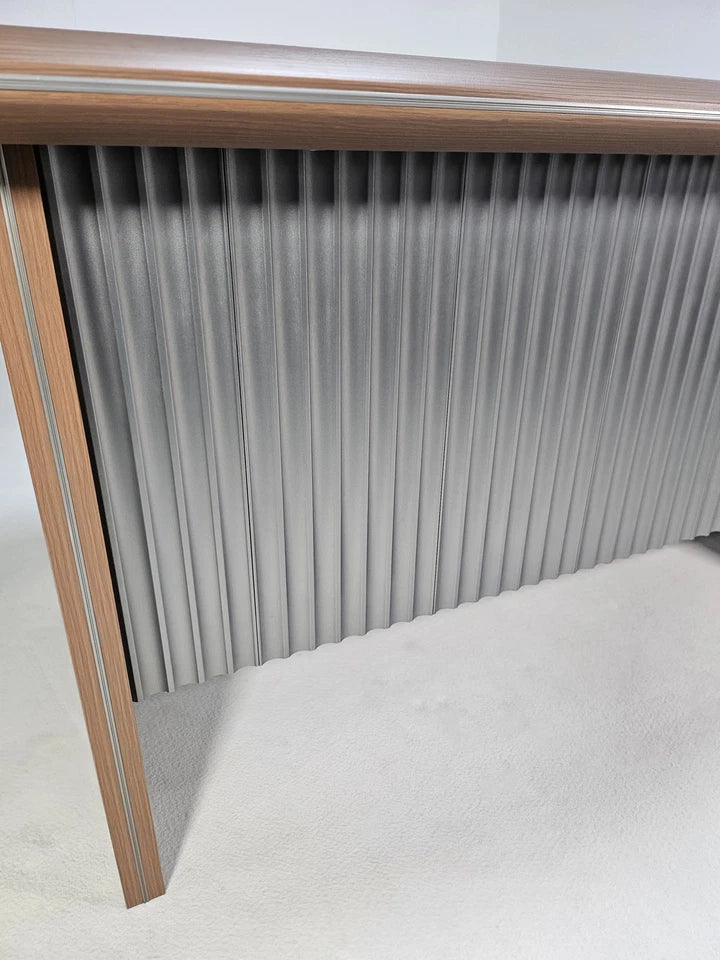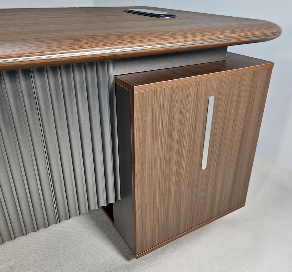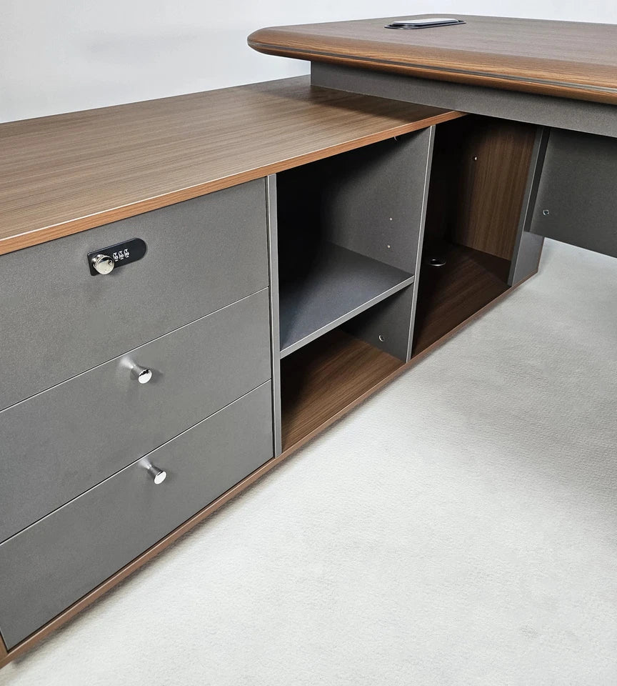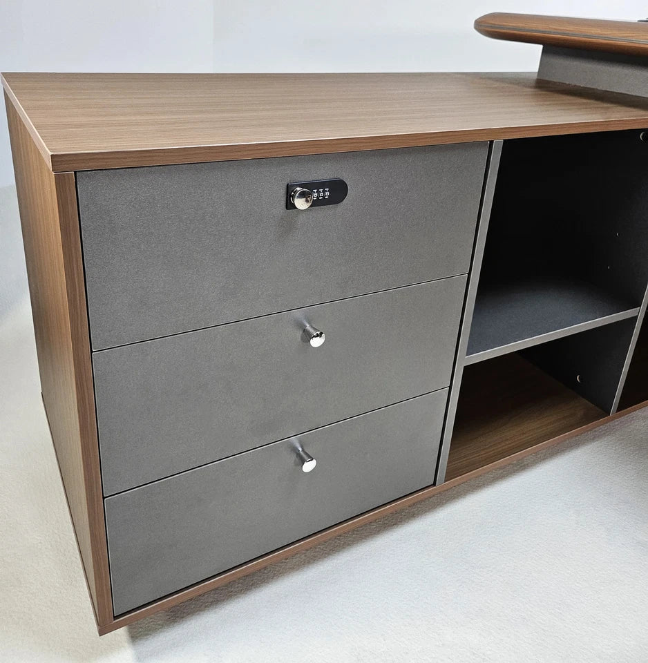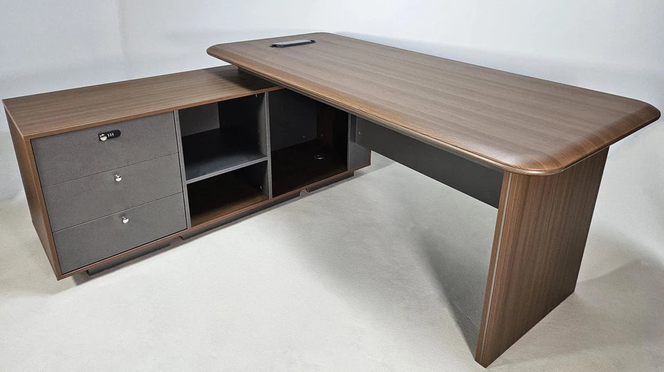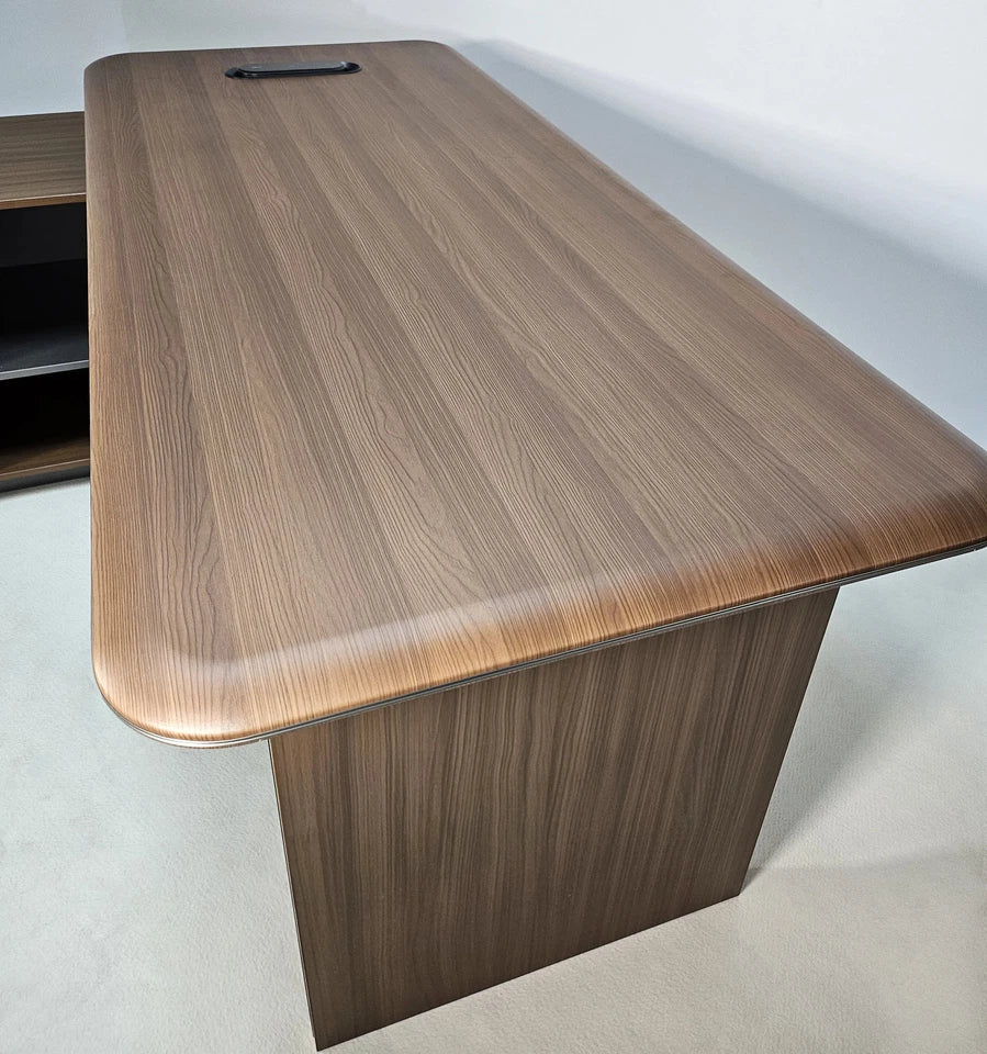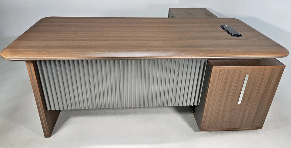 Upgrade your workspace with the Seraphina L-Shaped Corner Desk, a premium executive workstation designed to bring sophistication, function, and efficiency into any professional environment. Finished in rich American walnut melamine and accented with a bevelled desktop edge and aluminium trim, this desk delivers a refined, modern aesthetic that elevates any office. Its reversible design allows you to configure the return on either the left or right side, ensuring a perfect fit for your room layout and workflow.