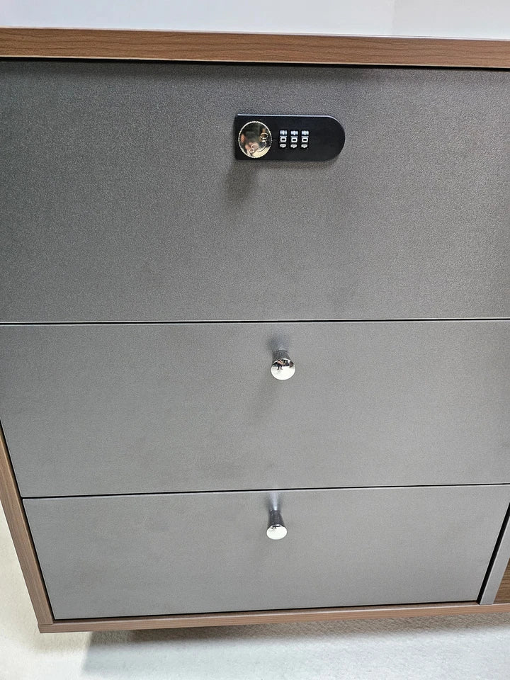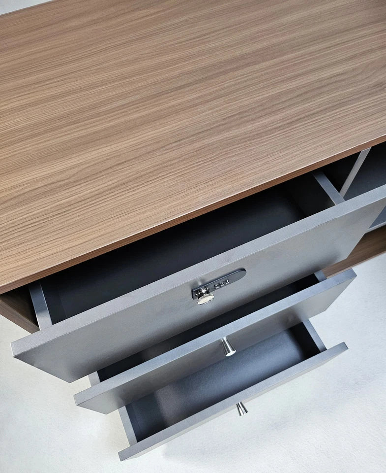 Engineered for productivity, the Seraphina desk features a built-in desktop power box with UK sockets and USB-A/USB-C charging, integrated storage solutions, and a ribbed grey modesty panel for enhanced privacy. Whether used in a home office or corporate setting, this workstation provides generous surface space, secure storage, and a practical design that adapts to your needs—making it an ideal centrepiece for any executive workspace.