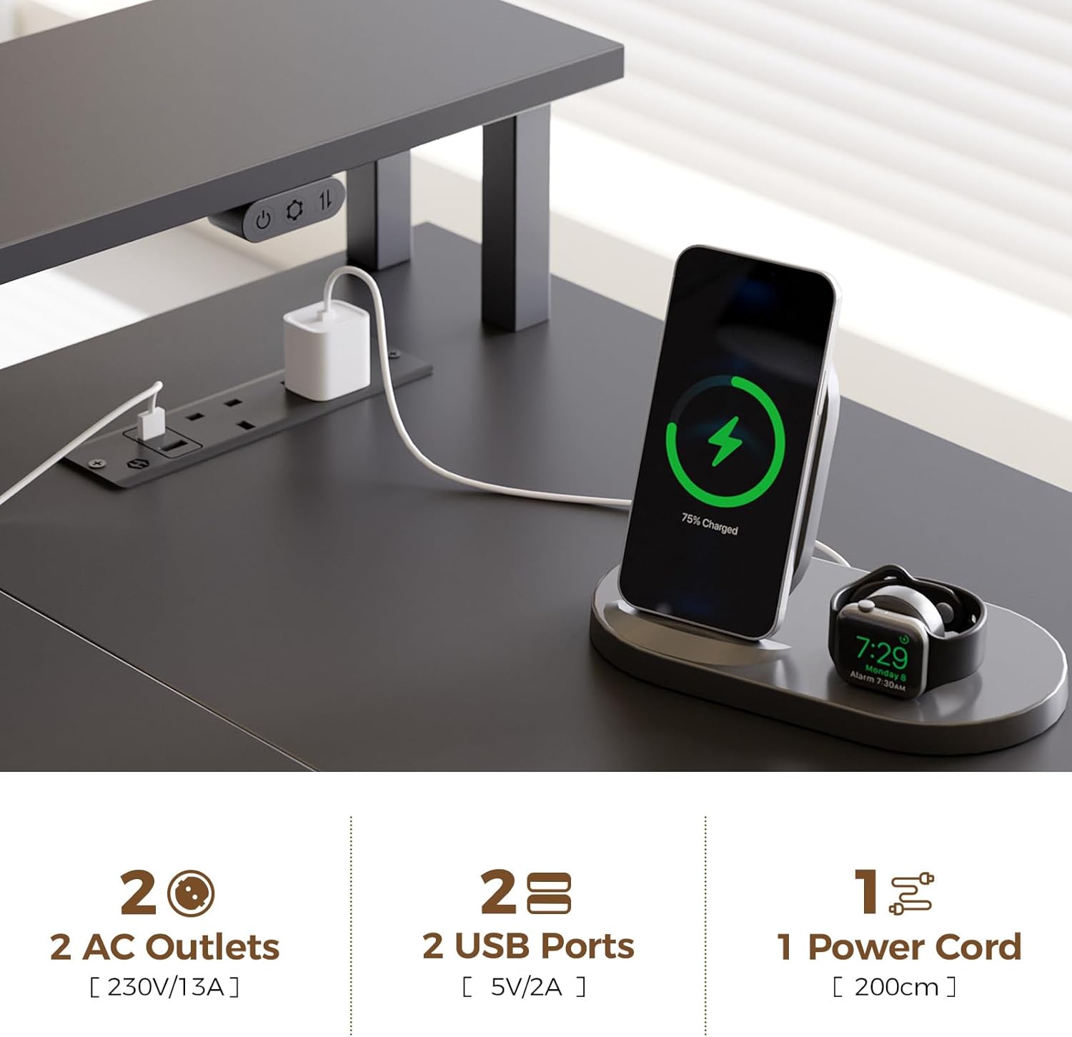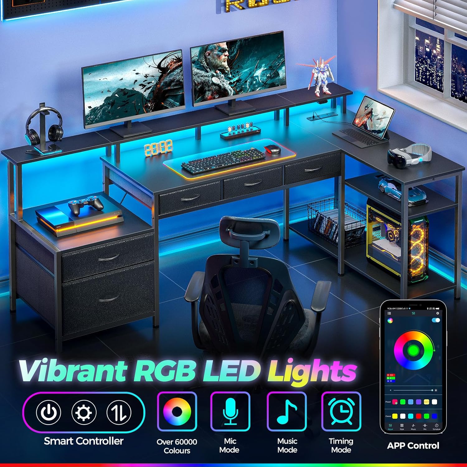 This desk is designed with practicality in mind, offering five drawers and a dedicated printer cabinet to keep files, devices, and supplies neatly organised. It also features a built-in power strip with 2 AC outlets and 2 USB ports, so you can conveniently charge your laptop, gaming gear, and phone without clutter. Adding to its appeal, the desk comes equipped with RGB LED lighting controlled via an app, offering over 6,000 colour options, music sync, and timer functions to create the perfect work or gaming atmosphere.