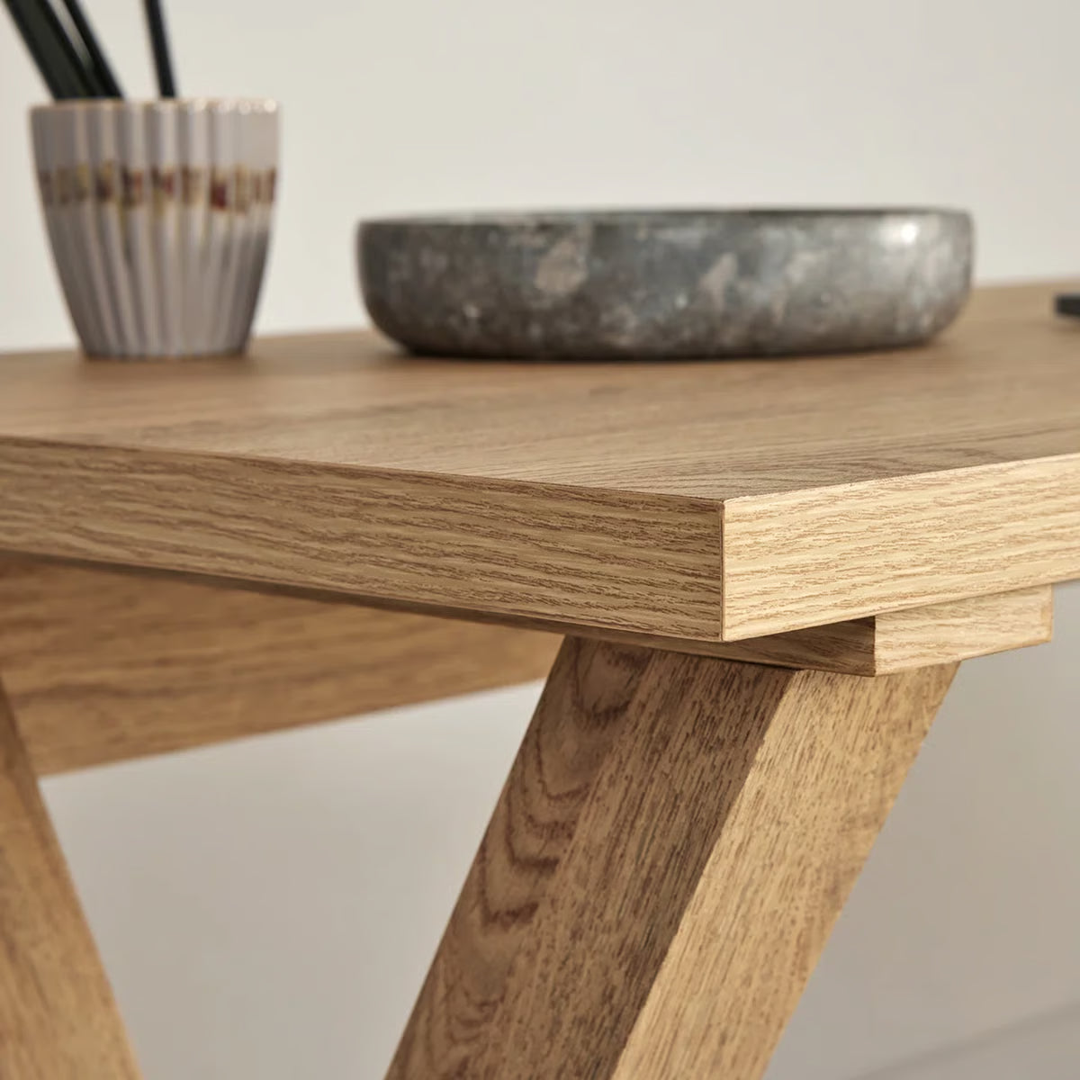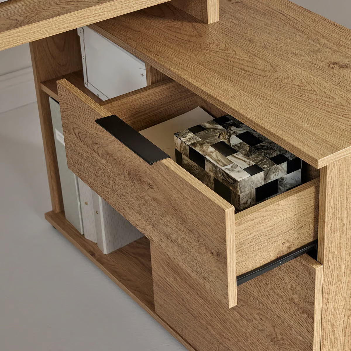 Function meets form with smart storage options including a large container unit featuring one drawer and a cabinet door, along with a spacious open shelf. The integrated cable management system keeps your setup neat and clutter-free. Finished in a refined noble oak look with a scratch-resistant surface, this desk delivers the authentic appeal of natural wood while offering the resilience needed for everyday use. Designed with precision German engineering and built in Indonesia, the Winston desk is a dependable solution for your home office or study.
