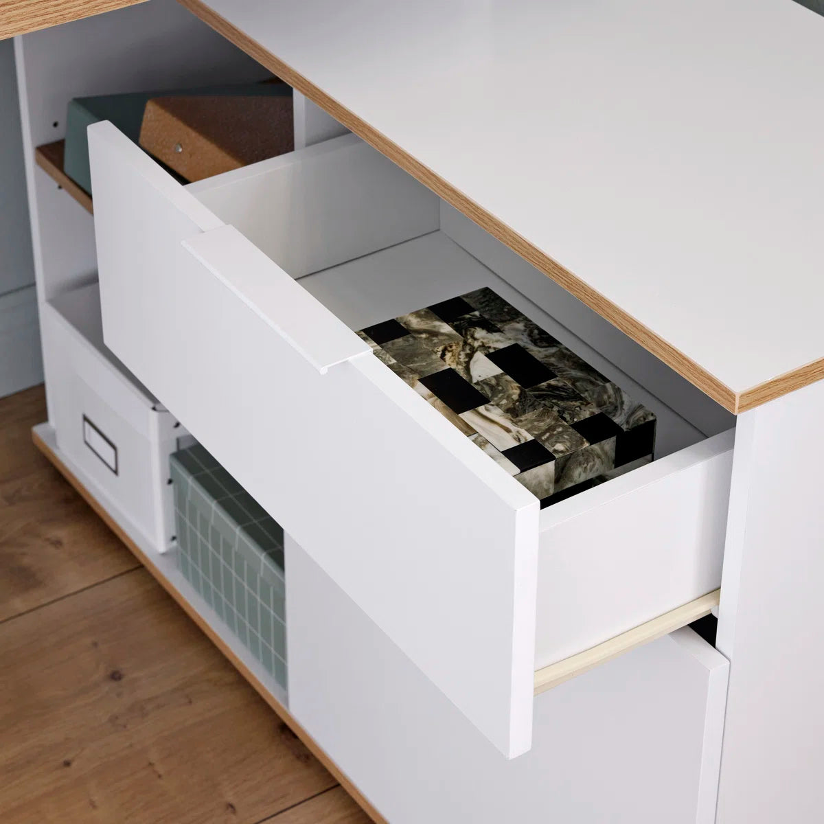 Function meets form with smart storage options including a large container unit featuring one drawer and a cabinet door, along with a spacious open shelf. The integrated cable management system keeps your setup neat and clutter-free. Finished in a refined noble oak look with a scratch-resistant surface, this desk delivers the authentic appeal of natural wood while offering the resilience needed for everyday use. Designed with precision German engineering and built in Indonesia, the Winston desk is a dependable solution for your home office or study.